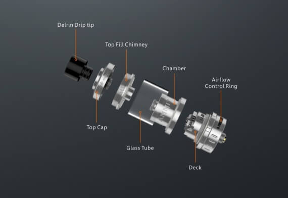 Что касается вместительности, то в Ammit 25 можно залить от 2 мл до 5 мл. Для увеличения объема в комплекте есть дополнительные детали. Подобные решения уже становятся привычными, так как дают возможность использования на различных модах. Самое главное, что увеличение объема бака никак не влияет на вкусопередачу бака и это огромная заслуга опытной компании GeekVape. Заправляется атомайзер через отверстие под верхней крышкой.