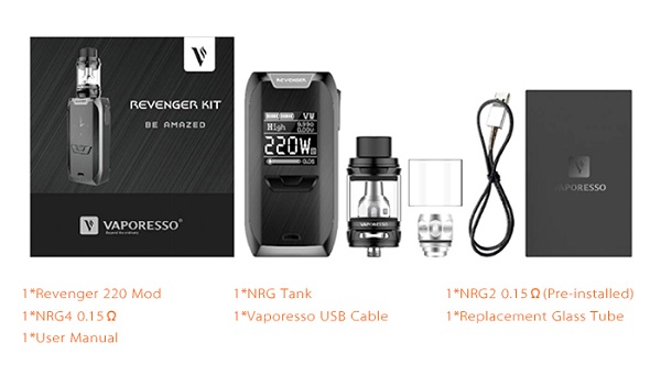 Компания Vaporesso уже заявила о себе, создав серию инновационных, уникальных модов и атомайзеров. Недавно она выпустила новый комплект Revenger TC Kit, состоящий из стильного боксмода на 220 Вт и бака NRG на 5 мл.