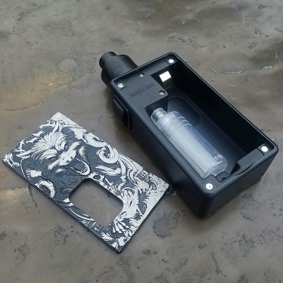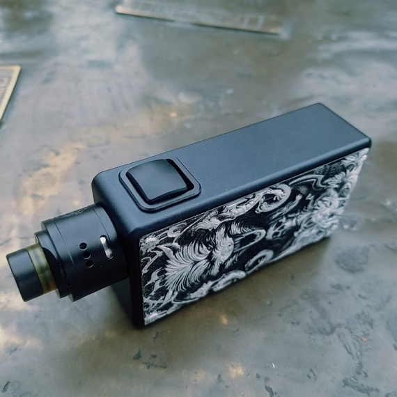 Начнем с дизайна: украшение устройства – рельефные боковые панели с черно-белым рисунком – выглядит интересно и небанально. Прямоугольная коробка с внушительными габаритами (100 х 46 х 25мм с атомайзером) выполнена из цинкового сплава, что не могло не повлиять на вес – набор вышел основательный – 120г. Форм-фактор для сквонкеров получился привычным, а вот о весе того же не скажешь. Большая кнопка FIRE кажется удобной. Предусмотрена защита от случайного нажимания – достаточно лишь сдвинуть ее вверх до упора.