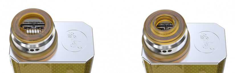 Дрипка Tobhino BF RDA, входящая в набор, в диаметре составляет всего 22 мм. В комплекте идет декоративное кольцо из жаропрочного пластика ULTEM, располагающееся у основания дрипки и увеличивающее диаметр до 25 мм. Топ кэп, который также выполнен из ULTEM’a, может быть как с посадкой под 810-ые дриптипы, так и под 510-ые – в комплект входят оба варианта. Атомайзер имеет боковой регулируемый обдув, а его база рассчитана на установку одной, но довольно крупной спирали.
