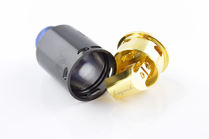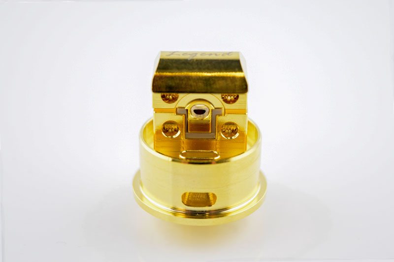 На базе расположились 4 довольно немаленьких отверстия для зажима ножек спиралей. Верхняя часть с гравировкой Legend, напоминающая полукруглую крышу – плюсовой контакт, нижняя – минусовой. Они разделены с помощью изолятора. У основы базы располагаются 4 овальных отверстия для регулировки обдува, который осуществляется прокручиванием вправо/влево. Возможен нижний и боковой обдув только для двух спиралей.